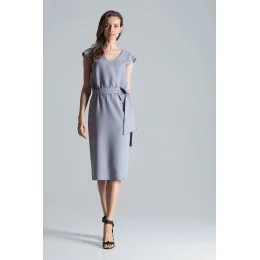 Šedé midi šaty s véčkovým výstřihem a elastickým páskem v pase. Přídavný látkový pásek. Asymetrický rozparek na levé nohavici, bez podšívky.