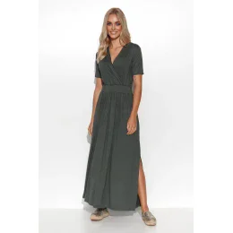 Dlouhé šaty s hlubokým výstřihem. Krátký rukáv, masivní guma všitá v pase.