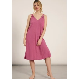 Dámské plážové šaty značky Muydemi. Šaty jsou vyrobeny z lnu a viskózy, ideální pro horké letní dny. Šaty jsou volné, jednoduchého střihu s délkou pod kolena. Výstřih je do tvaru V. Šaty mají širší ramínka a na bocích mají rozparky.