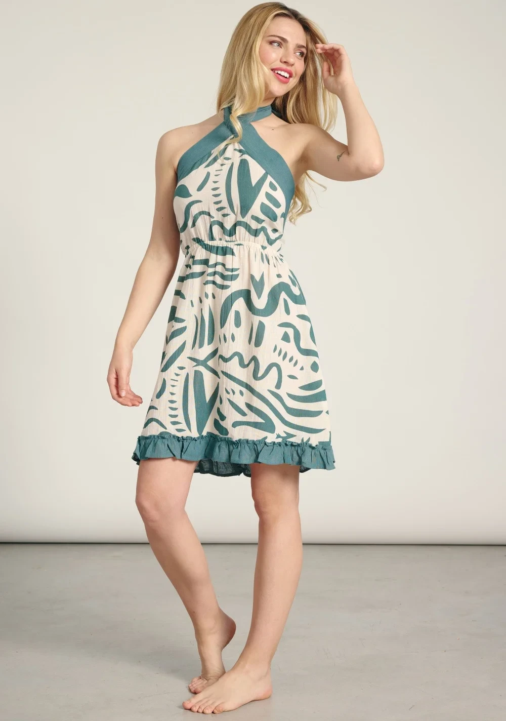 Dámské plážové šaty značky Muydemi. Šaty jsou vyrobeny ze 100% viskózy, ideální pro horké letní dny. Šaty jsou volné s délkou nad kolena a mají zavazování za krk.