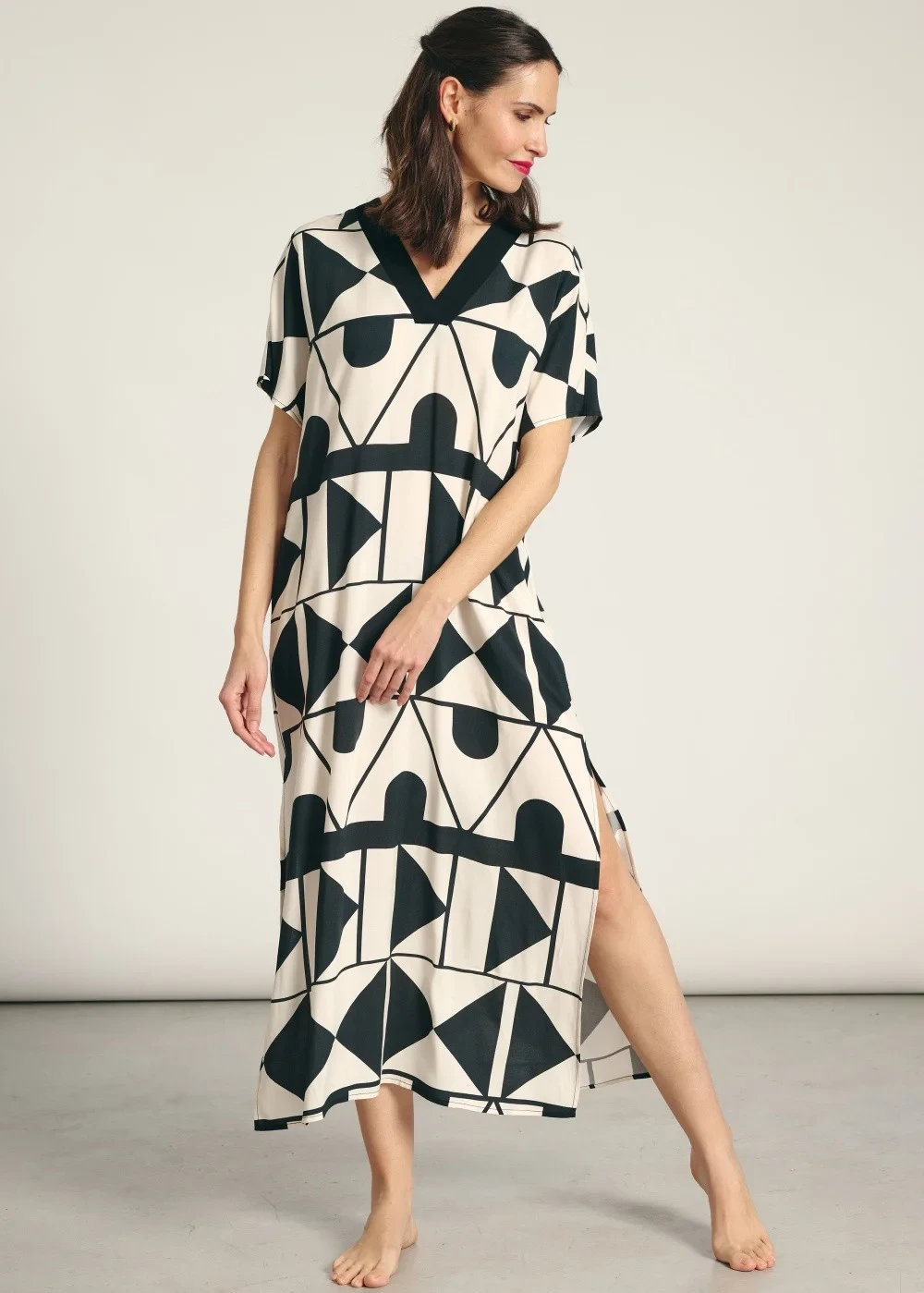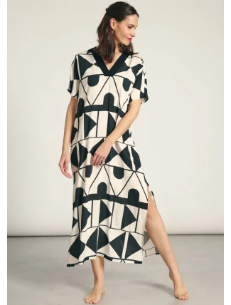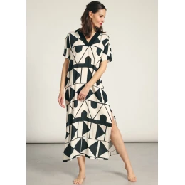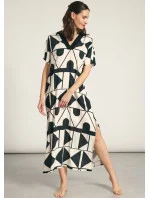 Dámské plážové šaty značky Muydemi. Šaty jsou vyrobeny ze 100% viskózy, ideální pro horké letní dny. Šaty jsou volné, jednoduchého střihu, s délkou po kotníky. Šaty mají krátký rukáv a výstřih do V.