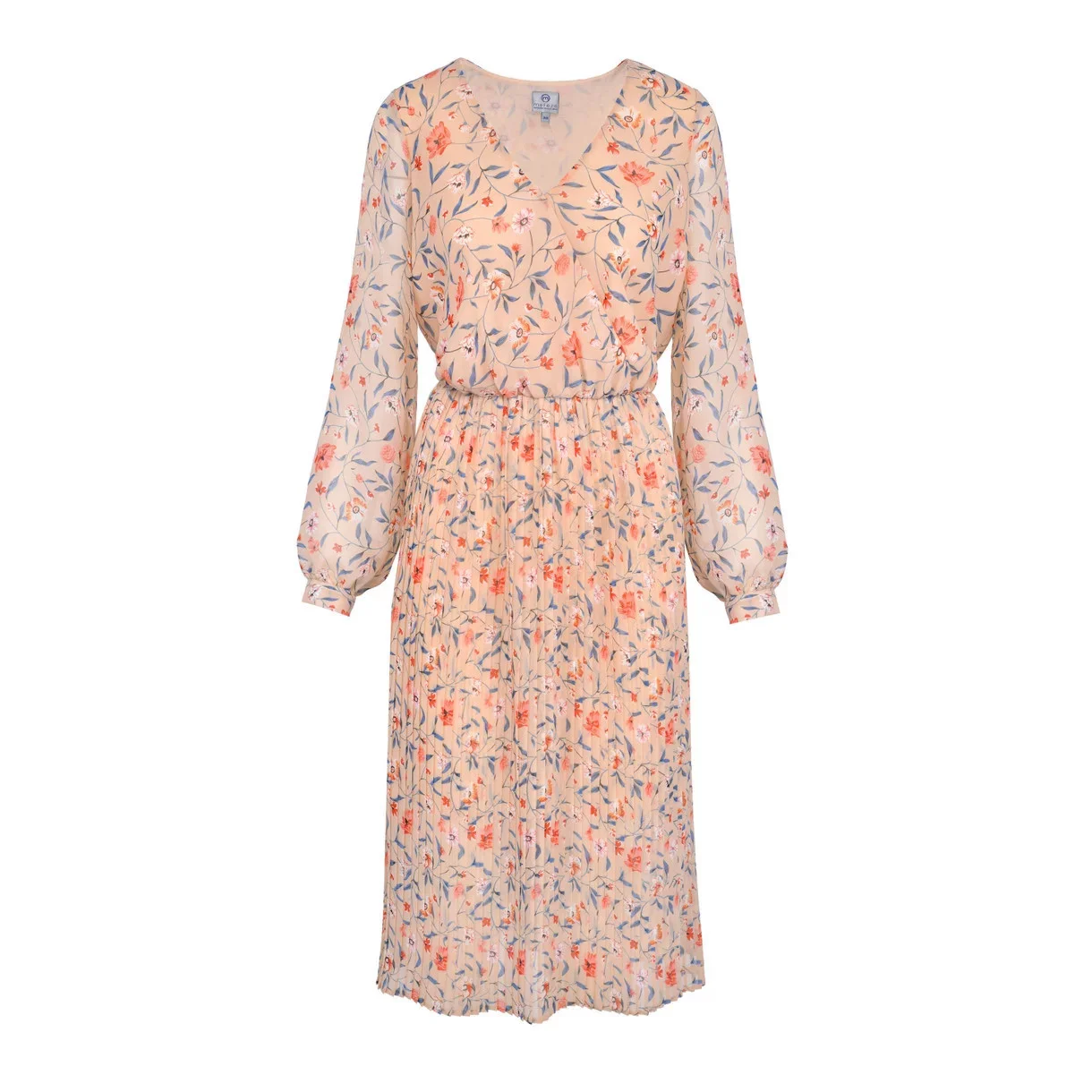 Dlouhé plisované květinové šaty s dlouhými rukávy a nabíranou plisovanou sukní.