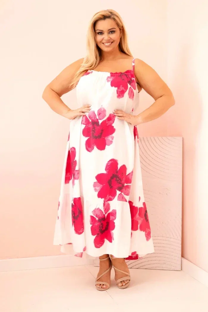 Tato dámská šaty na tenkých ramínkách jsou ztělesněním letního stylu a pohodlí. Vyrobeny ze 100% lehké a prodyšné viskózy, jsou ideální na horké dny. Romantický květinový vzor a jemný volánek na spodním lemu dodávají šatům dívčí kouzlo a volný střih zajišťuje plnou volnost pohybu.