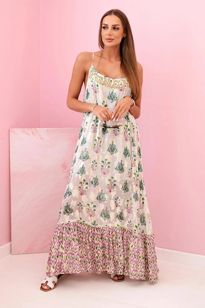 Tato výjimečná dámská šaty na ramínka je ideální volbou pro teplé letní dny. Vyrobena z prodyšné viskózy, zajišťuje nejen pohodlí při nošení, ale i stylový vzhled díky orientálním motivům a jemnému volánu ve spodní části. Horní část šatů je ozdobena zlatými detaily, které krásně odrážejí světlo a dodávají celku jemný lesk. Volný střih zajišťuje, že šaty netlačí na tělo a skvěle se hodí na procházky, dovolenou nebo letní oslavy. Můžete je kombinovat se sandály, kloboukem a jemnými šperky a vytvořit romantický ženský styl. Velikost je univerzální a hodí se pro dámy ve velikostech S, M nebo L.