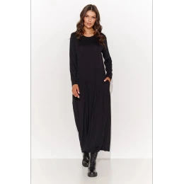 Maxi šaty ze vzdušného viskózového úpletu jsou k dispozici v grafitovém melanžovém, velbloudím, cappuccinovém, khaki a černém provedení. Šaty mají kulatý výstřih a na zádech mají všitou halenku. Na bocích jsou přítomny nakládané kapsy. Šaty mají asymetrické prošívání umístěné mírně pod pasem. Dlouhé rukávy zajišťují volnost pohybu. Senzační volba pro efektní styling do práce nebo do společnosti s přáteli. Zejména v kombinaci s vlněným kabátem.