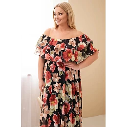 Efektní dámské šaty Plus Size v hispánském stylu jsou vynikající volbou pro ženy, které si přejí spojit pohodlí s módním vzhledem. Model okouzluje krásným květinovým vzorem a širokým volánem u výstřihu, který jemně odhaluje ramena a dodává celku výjimečnou lehkost. Vzdušný střih způsobuje, že se šaty volně přizpůsobují postavě, zajišťují komfort nošení a maskují drobné nedostatky figury.