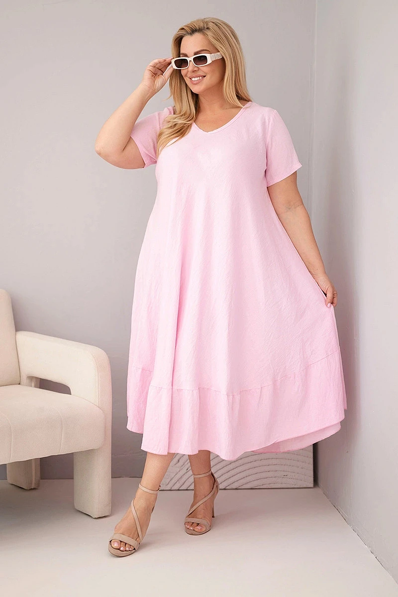 Dámské šaty plus size s krátkým rukávem a volánem z lehké viskózy bonbónová růžová