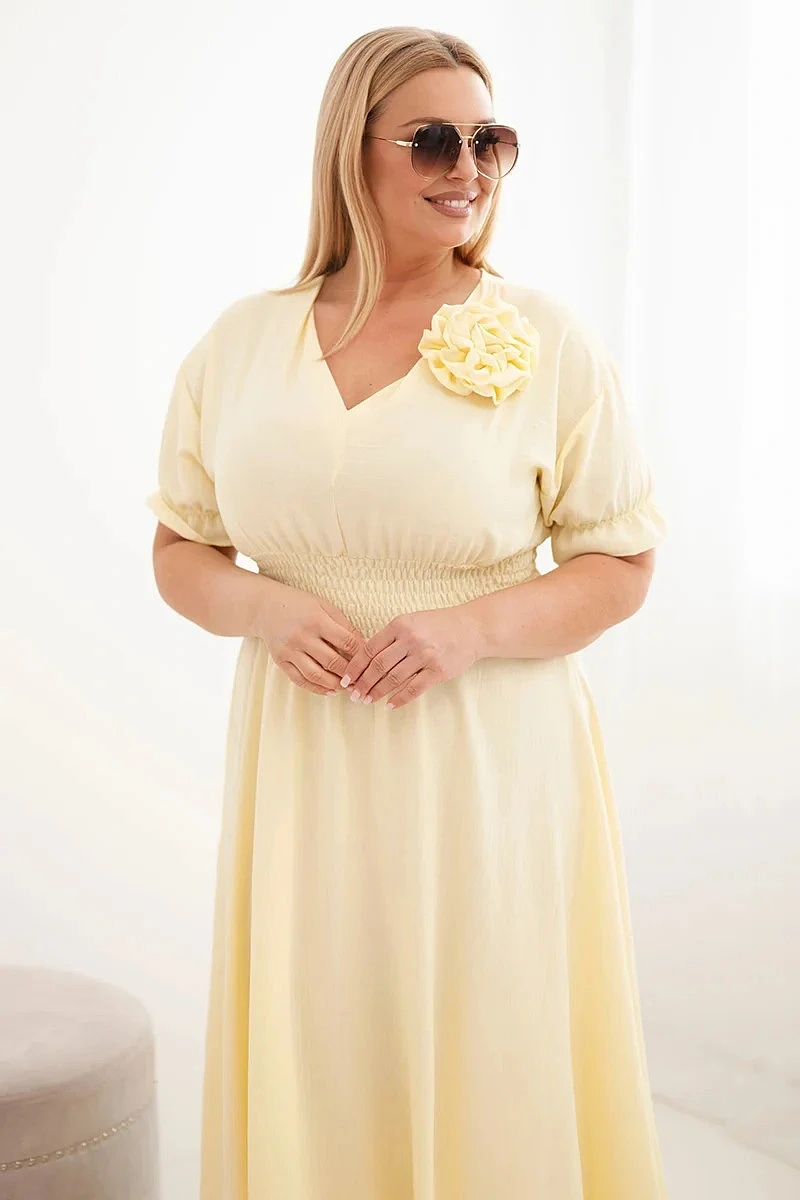 Elegantní a mimořádně pohodlné dámské šaty Plus Size jsou ideální volbou pro ženy, které si cení stylu a pohodlí v každodenních outfitech. Model se vyznačuje klasickým výstřihem do V, který opticky zeštíhluje krk a zdůrazňuje ženský charakter stylizace. Krátké rukávy zakončené jemnou volánkou dodávají lehkost a subtilní kouzlo.