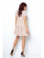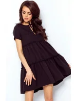Elegantní šaty s rozšířeným střihem. Vrchní část šatů je vypasovaná, s výstřihem ve tvaru slzy, který se u krku zavazuje na mašli. Šaty mají široké volány, které jim dodávají dívčí půvab. Model bez podšívky. Ideální pro různé příležitosti, hodí se jak k botám na podpatku, tak k lodičkám nebo sportovní obuvi. Šaty vyrobené v Polsku, což zaručuje vysokou kvalitu nabízeného produktu.