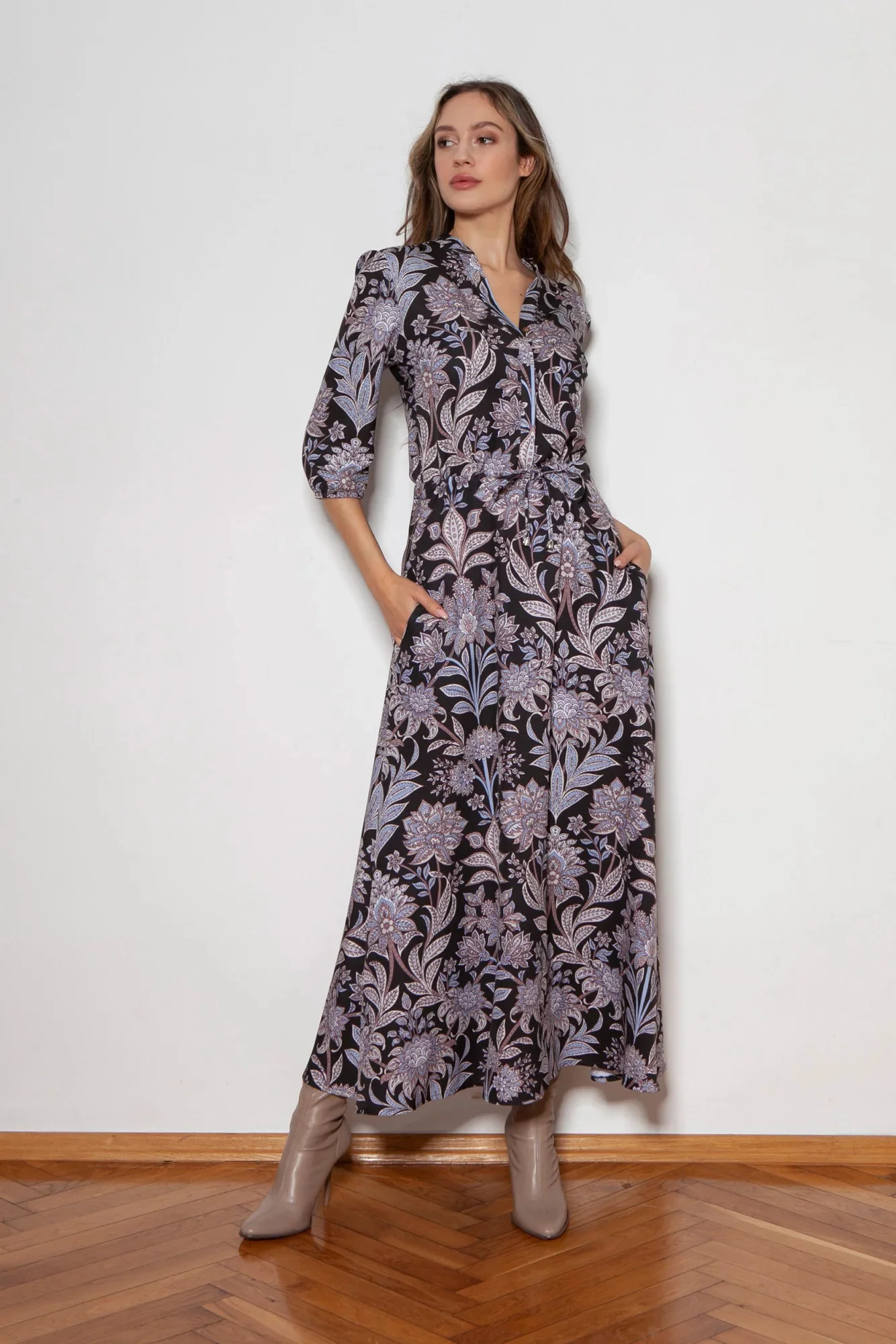 Pohodlné maxi šaty vyrobené v Polsku. Vysoce kvalitní tkaniny. Rukávy ve 3/4 délce zakončené gumičkou. Šňůrka v pase, která umožňuje přizpůsobení postavě. Kapsy v bočních švech, rozšířená spodní část, která se krásně pohybuje při každém kroku.