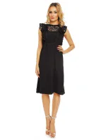 Jednoduché dámské šaty, které jsou doplněny krajkou. Tento model má velmi krátké rukávky, které zakrývají spíše jen ramena. Rukávky jsou tvořeny krajkou ze dvou vrstev. Krajka sahá téměř po pás a to v přední, ale i zadní části tohoto modelu. Šaty jsou bez výstřihu. Je lehce odhalen pouze dekolt, který je zakrytý stejnou krajkou. V pase je guma, která je velmi elastická. Následuje delší hladká sukně, která sahá pod kolena. Zapínání u tohoto modelu je řešeno pouze knoflíkem za krkem, jinak jsou záda lehce odhalená. Oblečte si tyto šaty na společenskou událost, večírek nebo posezení s přáteli.
