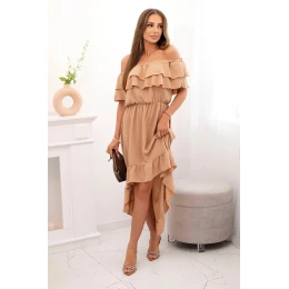 Dámské šaty s odhalenými rameny a prodlouženými zády velbloud