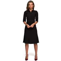 Zapínání v pase na pásek s přezkou, sukně šikmého střihu a vrchní díl na zip s klasickým límcem - to je módní oděv.