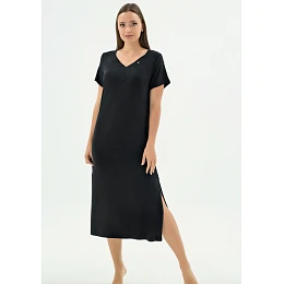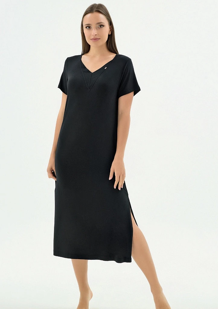 Elegantní dlouhé šaty značky Sevim v černém provedení je ideální volbou pro ženy, které hledají maximální pohodlí v kombinaci s nadčasovým stylem. Šaty jsou vyrobené z kvalitního mikromodalu, který je mimořádně jemný, prodyšný a příjemný na dotek. Materiál se krásně přizpůsobí postavě a zajistí komfort po celou noc. Model má výstřih do V, který opticky prodlužuje krk a dodává celkovému vzhledu ženskou eleganci. Dlouhý střih poskytuje dostatek pohodlí i při chladnějších nocích a zároveň působí velmi vkusně a upraveně. Na boku košile je rozparek pro pohodlnou chůzi.