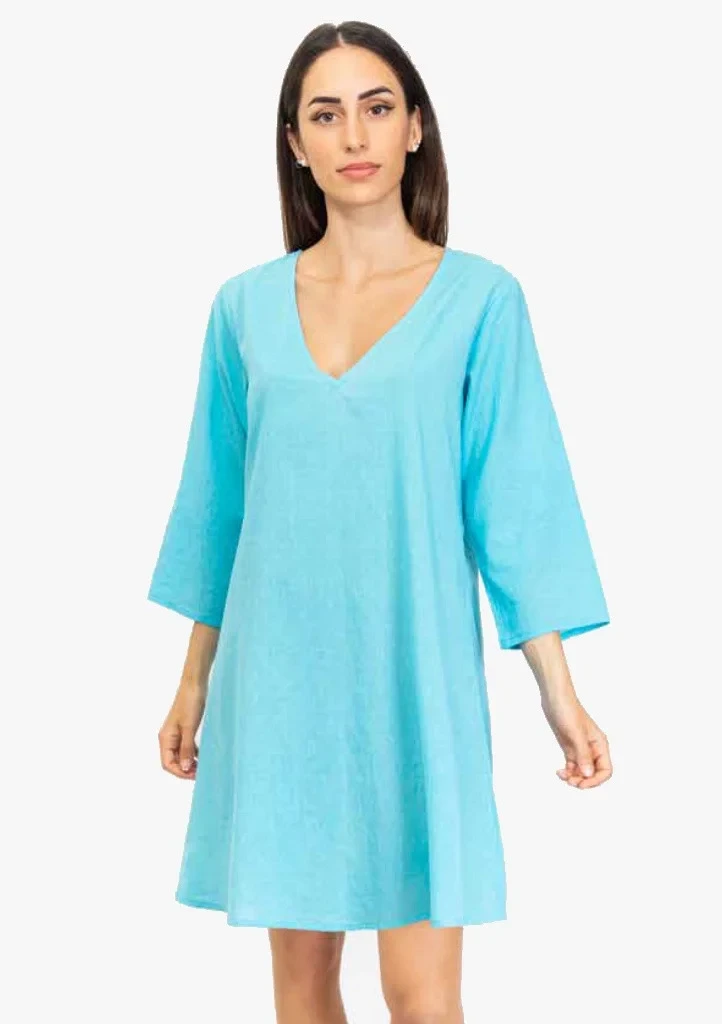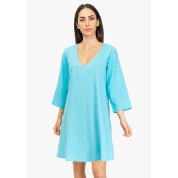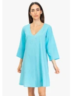 Dámské šaty italské značky Siélei. Šaty jsou vyrobené z příjemné plátěné látky na které je po celé ploše výšivka. Šaty mají 3/4 rukáv, mají volnější střih do "A" a výsřih do véčka.