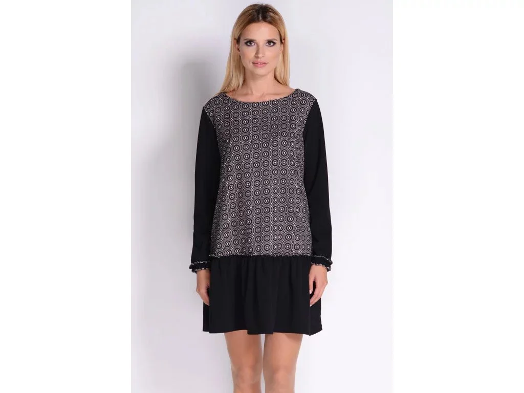 Stylové šaty boho s lodičkovým dekoltem a dlouhými rukávy s ozdobným volánkem. Spodní část je lémovaná také nežným volánkem. Volný, oversizový střih. Šaty jsou vyrobené z lehce elastického materiálu s módním vzorem. Tento model perfektně padne na těle a hodí se k legínám nebo punčocháčům. Modelka na obrázku měří 175 cm a nosí velikost S. Složení: 95% polyester, 5% elastan Rozměry: Obvod hrudníku - kolem 104 cm Délka od ramene - kolem 85 cm Délka rukávu od ramene - kolem 60 cm