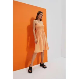 Extrémně ženské šaty, s otevřenými rameny, širokými ramínky. Oranžová barva. Hladké, bez vzorů. Horní část šatů je ve formě stahovací šňůrky. Dokonale se přizpůsobí postavě a zdůrazní ženské tvary. Spodní díl šatů je volný, volný a rozšířený. Délka nad kolena. Vyrobeno z příjemné na dotek a vzdušné viskózy. Ideální na pláž a každodenní styling. Ideální na léto, to musíte mít!