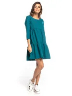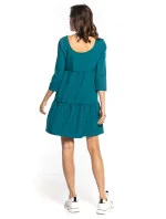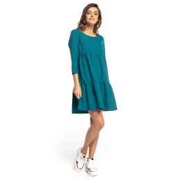 Mini šaty s 3/4 rukávy a lodičkovým výstřihem. Šaty jsou vyrobeny z volánků s rozšířeným střihem. Konstrukce jistě zakryje případné nedokonalosti těla a neomezuje v pohybu. Hluboký výstřih na zádech.