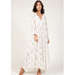 Lehkost, ženskost a francouzský šarm v jednom – to jsou tyto bílé maxi šaty od značky Terre Rouge. Jsou ušité z příjemného vzdušného materiálu, ideálního na teplé dny. Jemný zlatý vzor po celé délce dodává šatům nádech elegance a originality. Volný střih s nabíranými patry, výstřih do V a dlouhé rukávy zakončené gumičkou podtrhují uvolněný, ale stylový vzhled. Skvělé na dovolenou, letní oslavy i procházku městem.