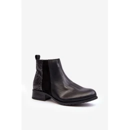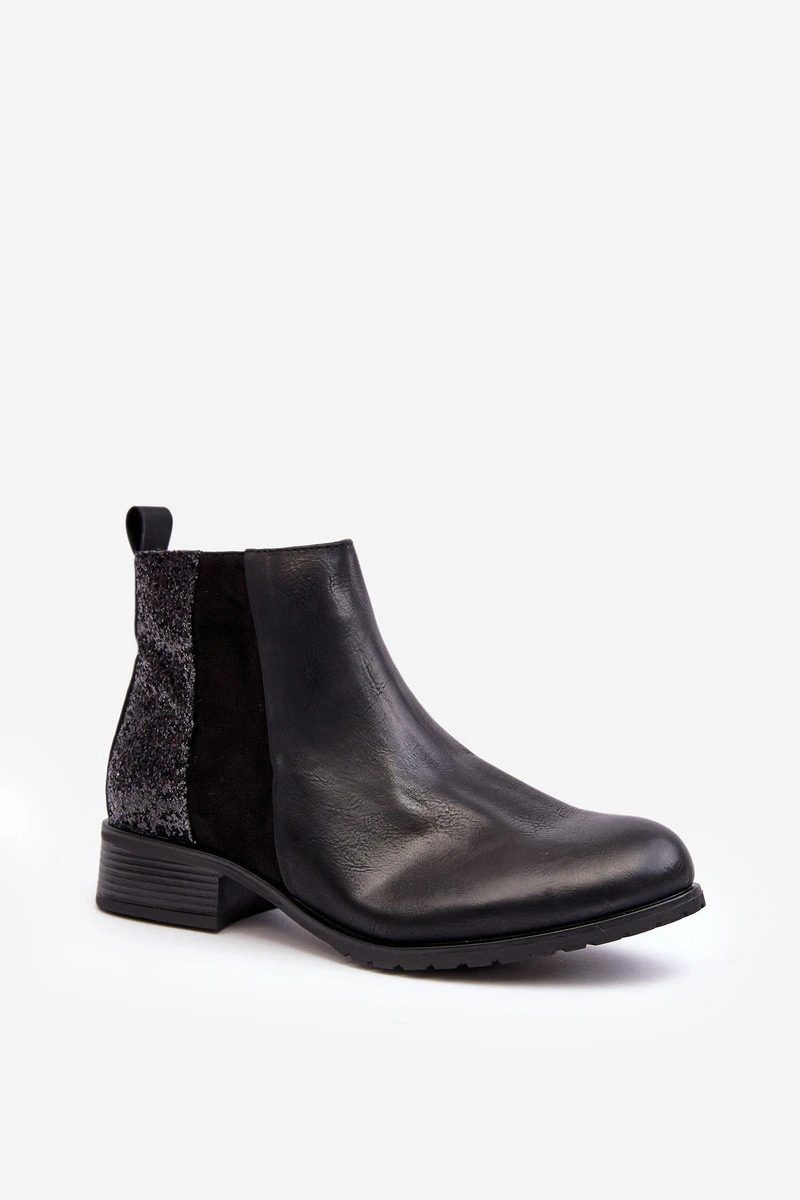 Dámské boty na plochém podpatku. Vyrobeno z ekologické kůže. Zapínáno na zip po straně. Horní část na kotníku ozdobená malými flitry. Špička zaoblená. Vnitřek zateplený obuvním kožíškem. Tento klasický model můžete přizpůsobit mnoha jarním a zimním stylům!