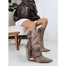 Stylové kovbojské kozačky z měkkého eko-semiše inspirované boho trendem s charakteristickými střapci na bocích. Model s mírně špičatým nosem a decentním podpatkem kombinuje eleganci s pohodlím. Hodí se k šatům, sukním i dlouhým kabátům a podtrhuje ženský styl.