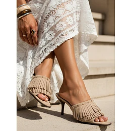 Žabky s úzkým podpatkem kombinují ženský charakter s pohodlím nazouvacího provedení. Ozdobné střapce dodávají stylingu lehkost a podtrhují letní atmosféru. Svršek je vyroben z eko-semiše. Otevřený nos odhaluje chodidlo a dobře funguje během teplých dnů.