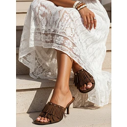 Tyto žabky s úzkým podpatkem kombinují ženský nádech s pohodlím nazouvacího provedení. Ozdobné střapce dodávají stylingu lehkost a podtrhují letní atmosféru. Svršek je vyroben z eko-semiše. Otevřená špička odhaluje chodidlo a dobře se osvědčí v teplých dnech.