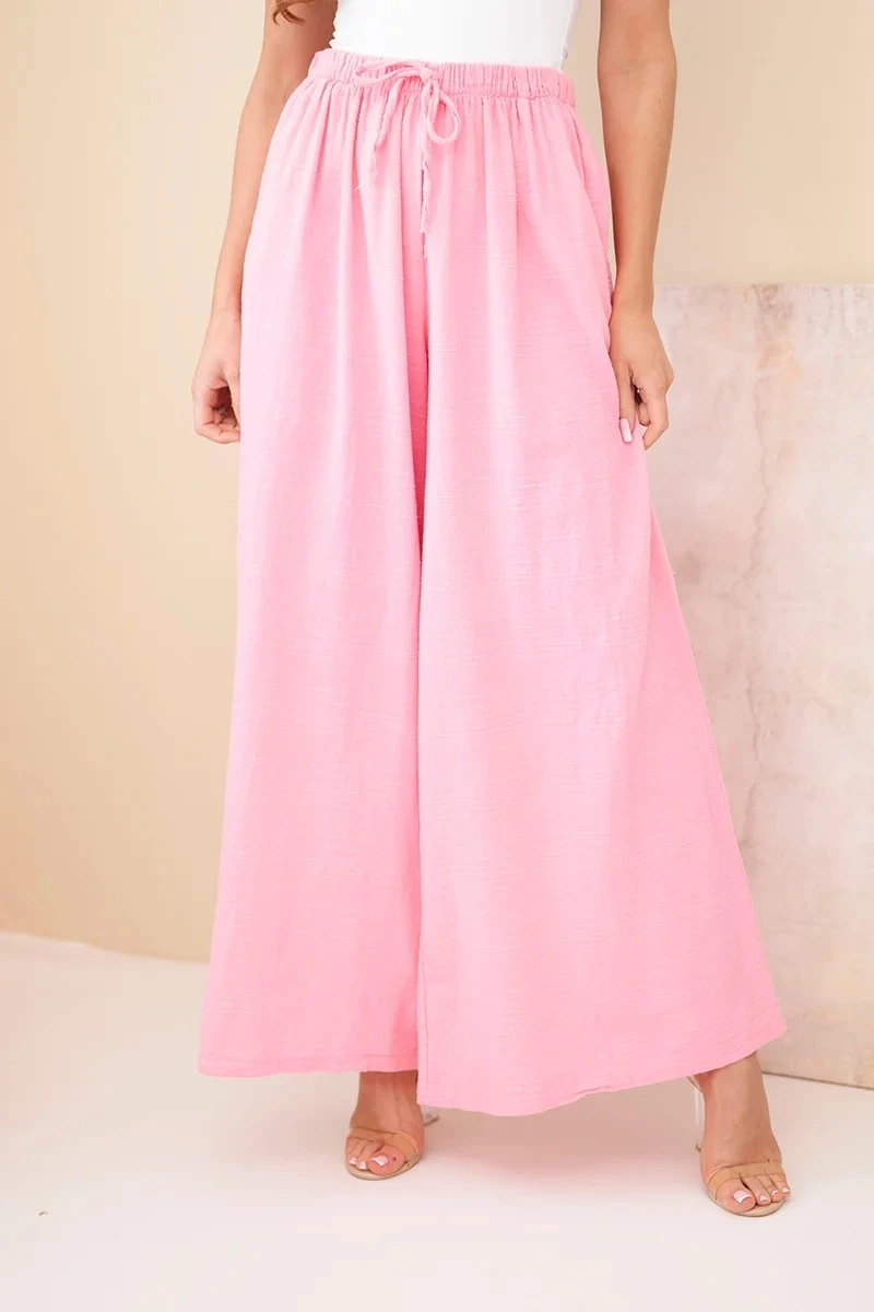 Dámské široké bavlněné kalhoty s gumou v pase cukrově růžová
