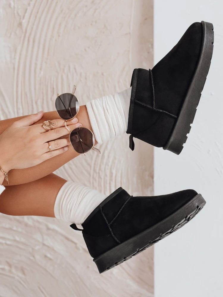 Model se semišovým svrškem z ekologické kůže se vyznačuje měkkým zateplením kožíškem a lehkou, stabilní platformou. Svršek v délce nad kotníky poskytuje pohodlí a volnost pohybu a klasický střih se hodí k mnoha zimním outfitům.