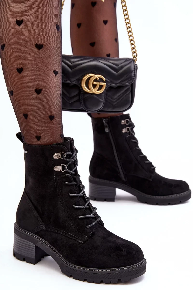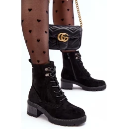 Dámské kotníkové boty vyrobené z eko semiše. Nasazené na nízkém stabilním podpatku. Boční svršky na zip. Šněrování vpředu. Vnitřek je zateplen dekou na boty. Zaoblené prsty. Tento model bude dokonalým doplňkem podzimního a zimního stylingu! Při výběru velikosti se řiďte tabulkou velikostí.