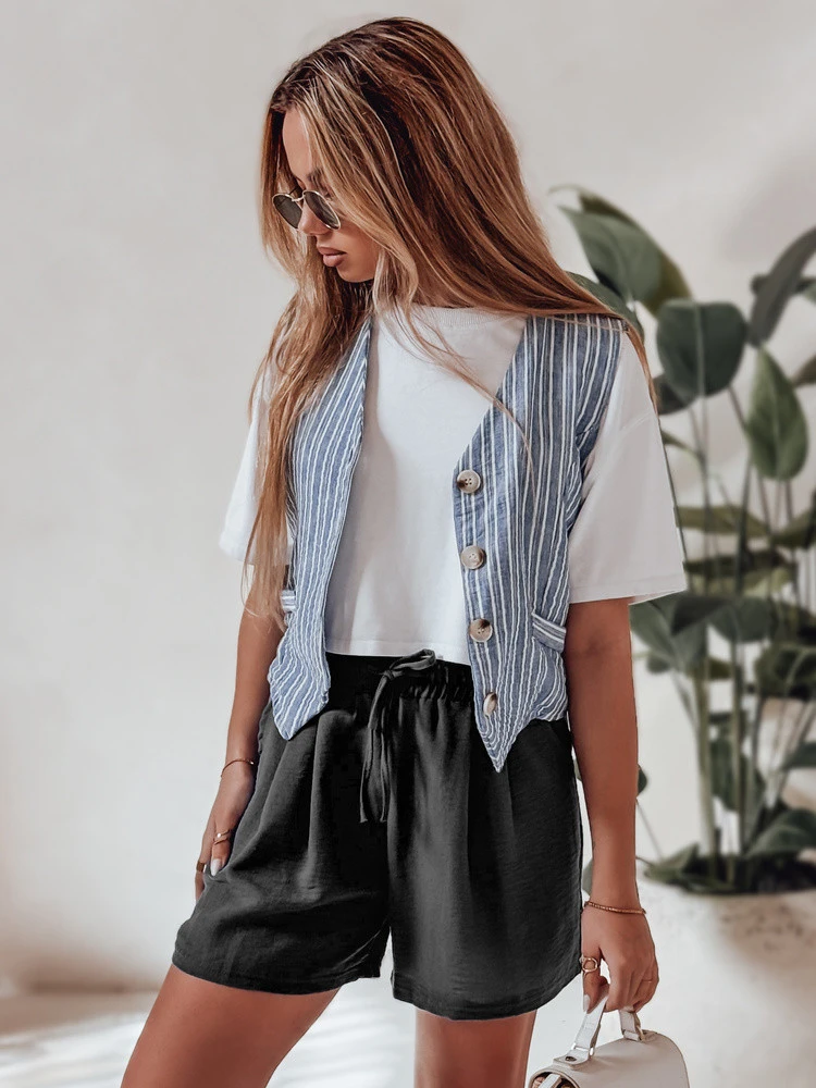 Tyto lehké šortky s vysokým pasem volného střihu jsou kombinací ležérního a stylového střihu, mají stahovací šňůrku v pase a elastický pás pro celodenní pohodlí. Dvě přední kapsy jim dodávají roztomilý nádech a díky lehkému materiálu jsou ideální pro letní dny a dovolenou.
