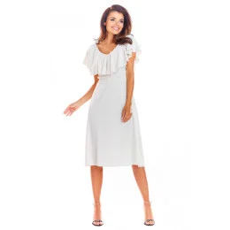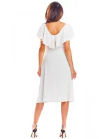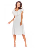 Mimořádně elegantní a ženské midi šaty. Výstřih je zdobený volánkem, který decentně zakrývá ramena. V pase má všitou gumu, díky které se přizpůsobí postavě. Šaty jsou vyrobeny ze splývavé látky, díky které krásně padnou. Zapínání na zádech na krytý zip. Letní jehlové podpatky se k němu skvěle hodí. Výrobek vyrobený v Polsku.