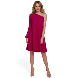 Šaty na jedno rameno s nápadnými bufetovými rukávy. Díky volnému, rozšířenému střihu se budete cítit lehce a šaty se budou krásně pohybovat. Skvěle se hodí k botám, jehlovým podpatkům nebo i lodičkám. Šaty se zapínají na krytý zip.