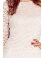 Krajkové společenské šaty v elegantním střihu. Tento model šatů působí velmi romanticky, díky krajkovému provedení a nádhernému nádechu růžové barvy. Šaty mají 3/4 rukáv, který je celý krajkový bez podšívky a kulatý výstřih ke krku. Šaty jsou tvořeny jako dvouvrstvé, první vrstva je z příjemného, neelastického materiálu, druhá vrstva je tvořena krajkou. Šaty mají délku nad kolena. Tyto šaty si můžete vzít na různé společenské události nebo i na párty.