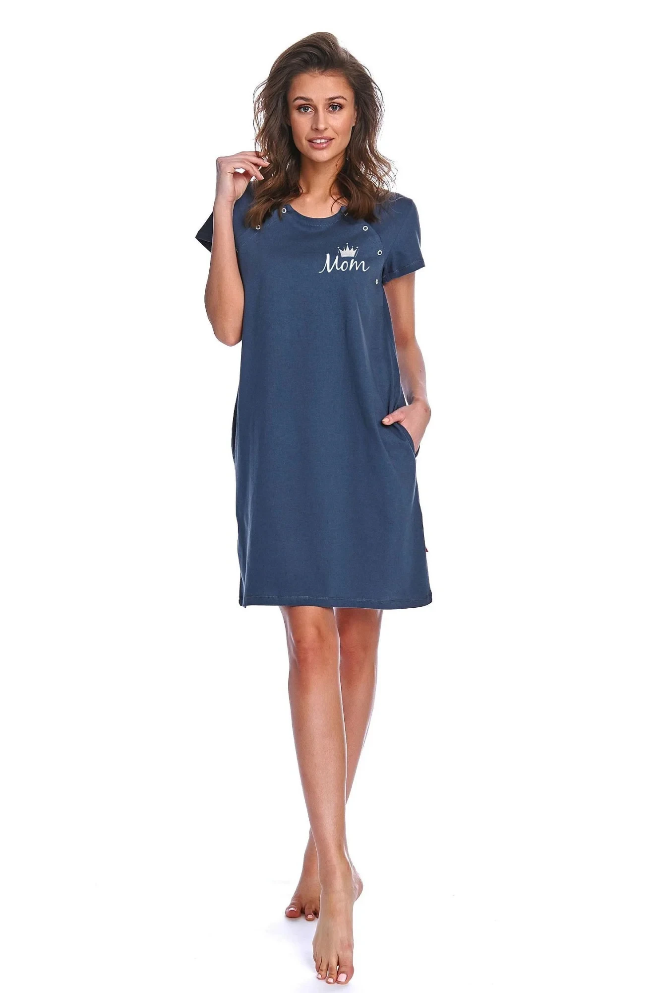 Dámská těhotenská košile 9992 blue Doctornap - tmavě modrá barva - z vysoce jakostní bavlny - s krátkými rukávy - zapínání na knoflíky - ozdobená potiskem na přední straně - na bocích kapsy - ideální pro těhotné a kojící ženy - certifikát OEKO-TEX Standard 100