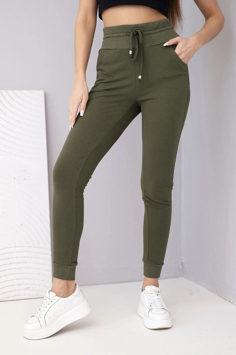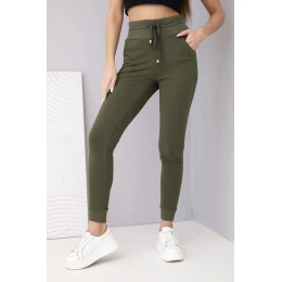 Dámské teplákové kalhoty s vysokým pasem a šňůrkou khaki