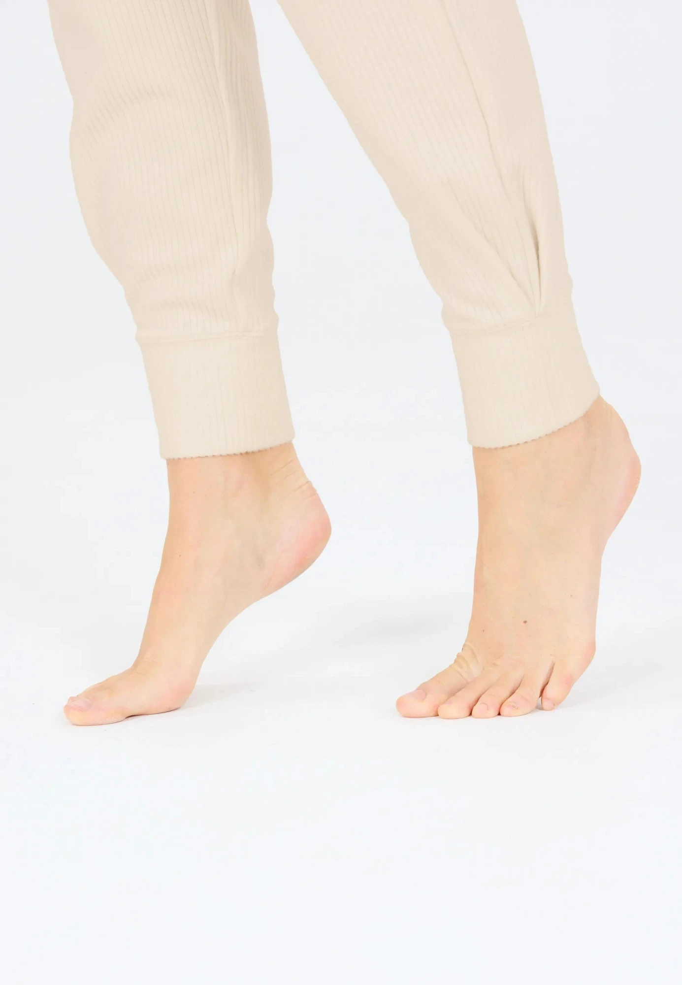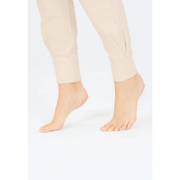 Tyto béžové dámské žebrované tepláky kombinují pohodlí s moderním minimalistickým stylem.