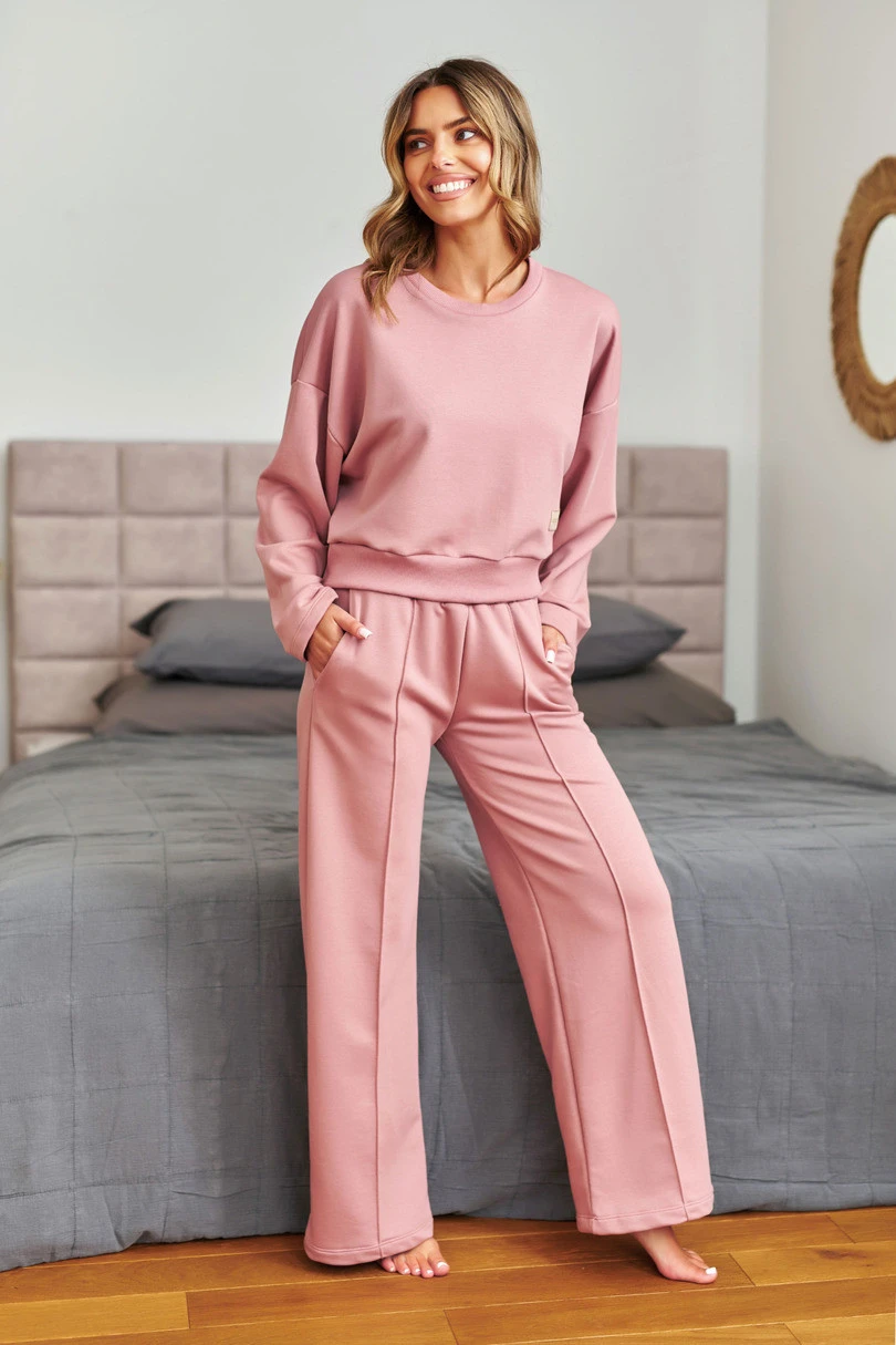 Dres damski DRS.7360 BIG J/25 od marki Dr Nap to doskonałe połączenie swobodnego stylu, wygody i jakości. Luźny, oversize’owy fason sprawia, że komplet sprawdzi się zarówno jako wygodny homewear, jak i stylowa odzież codzienna. Góra to koszulka z długim rękawem o lekko obniżonej linii ramion, która doskonale układa się na sylwetce, zapewniając komfort i pełną swobodę ruchów. Długie spodnie z prostą nogawką posiadają praktyczne kieszenie, dzięki czemu są nie tylko wygodne, ale i funkcjonalne.
