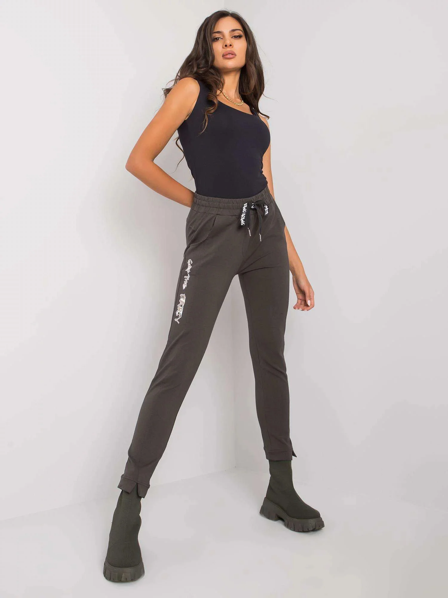 Tmavě khaki bavlněné dámské tepláky.
