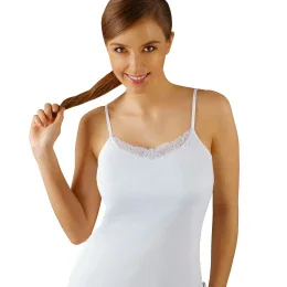 Dámské tílko s úzkými ramínky je vyrobené z příjemné bavlny (100%). Dekolt je zdobený všitou krajkou.