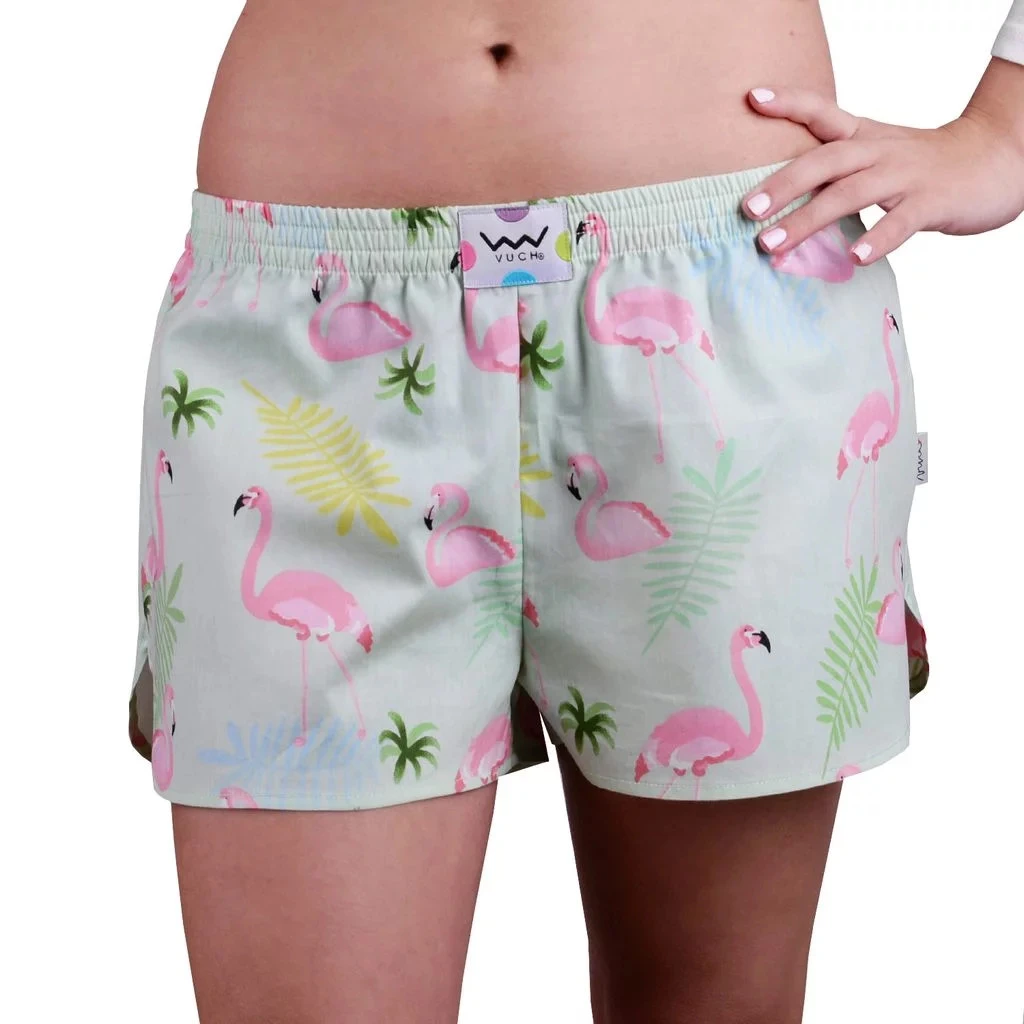 „Můžeš se cítit jako na exotické dovolené, i když venku třeba sněží. Jak? Obleč si tyhle dámské trenýrky zdobené plameňáky a užij si pravou domácí pohodu se vším, co k ní patří. Třeba s knížkou a koktejlem.“