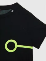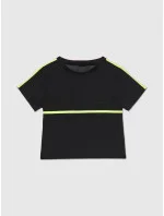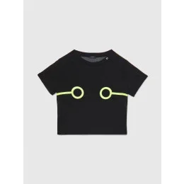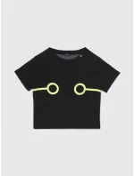 Měkké tričko ze strečové síťoviny s fluorescenčními obrysy. Kulatý výstřih je zvýrazněn kovovým logem D.