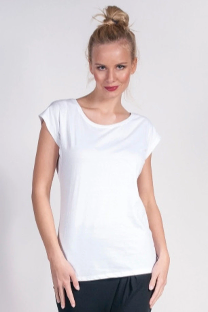 Dámské bavlněné triko. Materiál single jersey. Má elastický lem u krku, dvojté švy na bocích. 150g/m2. 100% bavlna ring spun. Barva 34: 90% bavlna, 10% viskoza.