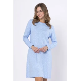Koszula damska KRYSPINA 1659 marki Leveza to połączenie komfortu, elegancji i najwyższej jakości wykonania. Uszyta w 100% z naturalnej bawełny o zwiększonej gramaturze (180 g/m²), zapewnia wyjątkową miękkość, przewiewność i trwałość. Model wyróżnia się klasycznym, okrągłym dekoltem, długim rękawem zakończonym ściągaczami oraz kobiecym krojem sięgającym przed kolano. Wzór w nieregularne groszki w kolorze atramentowego błękitu nadaje całości lekkości i subtelnego uroku. Idealna jako koszula nocna lub wygodna odzież domowa — sprawdzi się zarówno na chłodniejsze wieczory, jak i spokojne poranki.