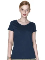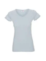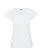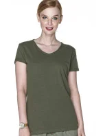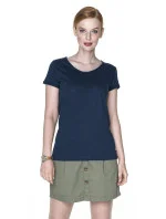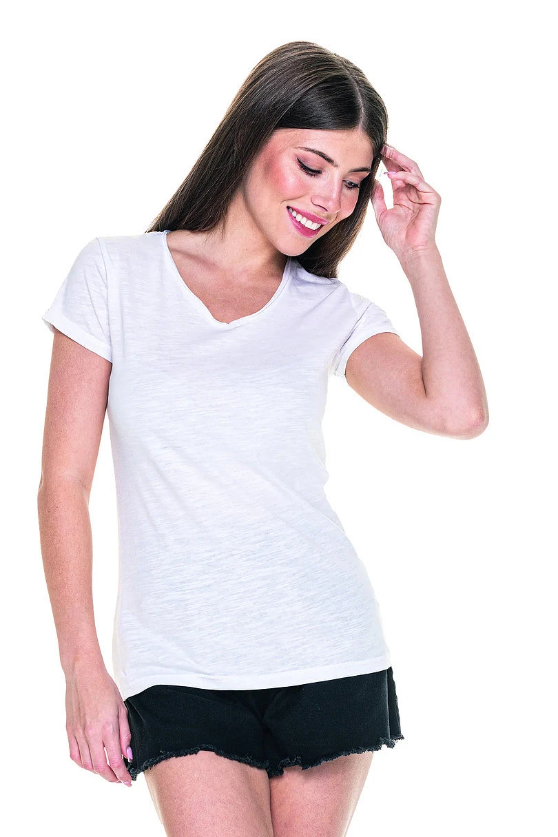 Dámské tričko z organické bavlny s véčkovým výstřihem. Materiál je měkký, příjemný, typu single jersey. Okraje rukávů jsou trojtě ohrnuté. Na krku a na ramenou jsou zpevněné švy. Dolní šev je dvojtý.