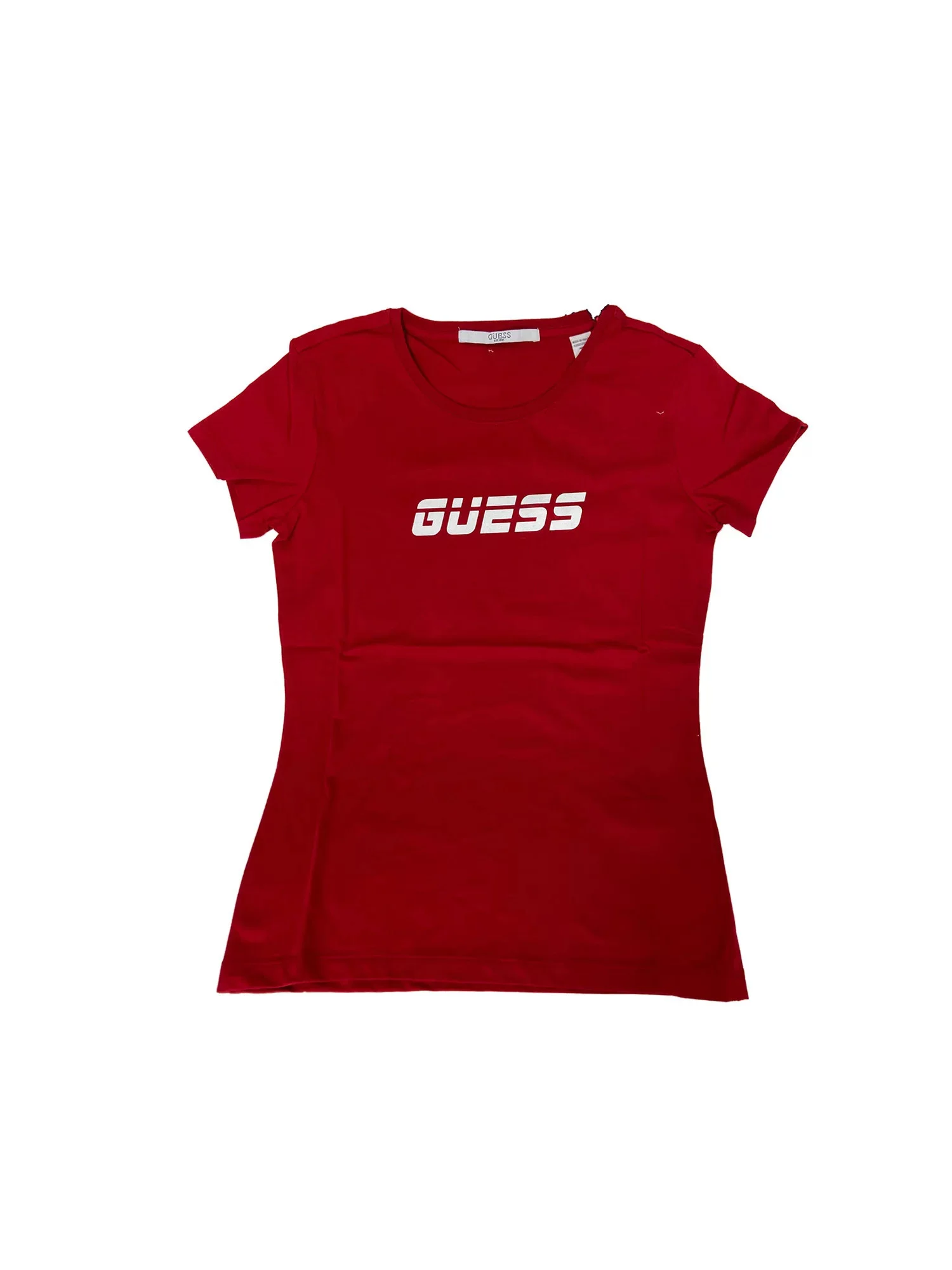 Dámské tričko s krátkým rukávem v červené barvě s Guess nápisem.