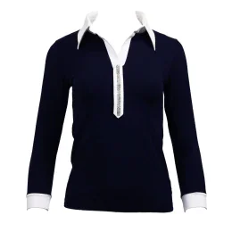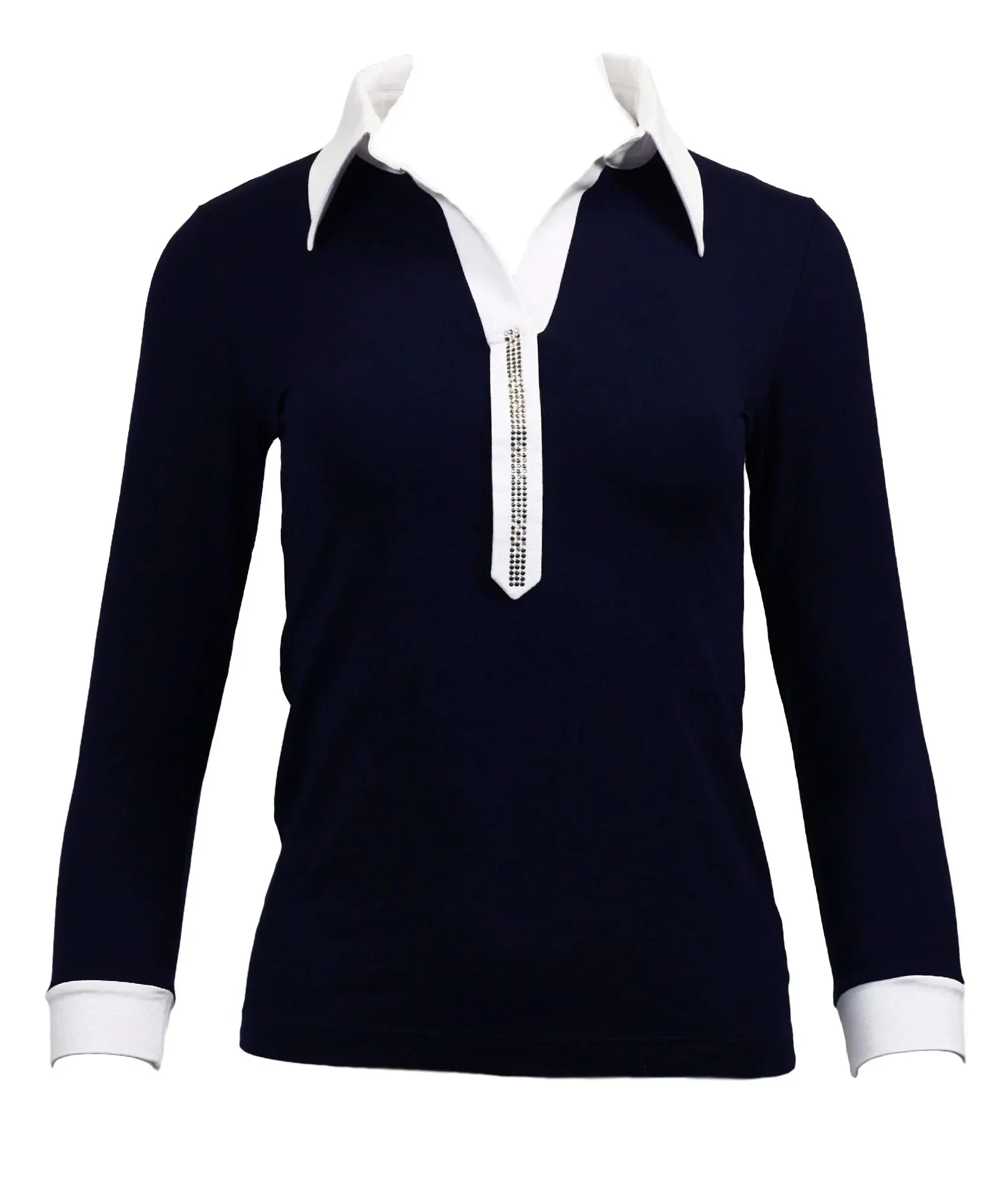Elegantní dámská halenka Favab košilového střihu, tmavě modré barvy s bílým límečkem a lemováním kolem rukávků.Léga zdobená malými kamínky, které oživují vzhled celé halenky. Materiál: 94% viskosa, 6% elastan