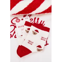 Hřejivé dámské vánoční ponožky v bílé barvě s roztomilým motivem medvídků v čepici Mikuláše. Vyrobené z měkké směsi s vlnou, která poskytuje tepelný komfort a měkkost při nošení. Ideální pro zimní období a vánoční atmosféru doma i do bot.
