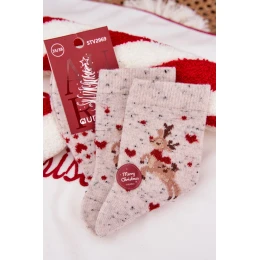 Hřejivé dámské vánoční ponožky v jemném šedém odstínu s roztomilým motivem soba a srdíček. Vyrobené z měkké směsi s podílem alpaky, která poskytuje teplo, měkkost a komfort při nošení. Perfektní volba pro zimní období a vánoční atmosféru doma i venku.