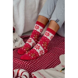 Veselé dámské vánoční ponožky v červené barvě zdobené motivem perníčků. Měkké, pohodlné a hřejivé, ideální pro zimní období a sváteční atmosféru doma.